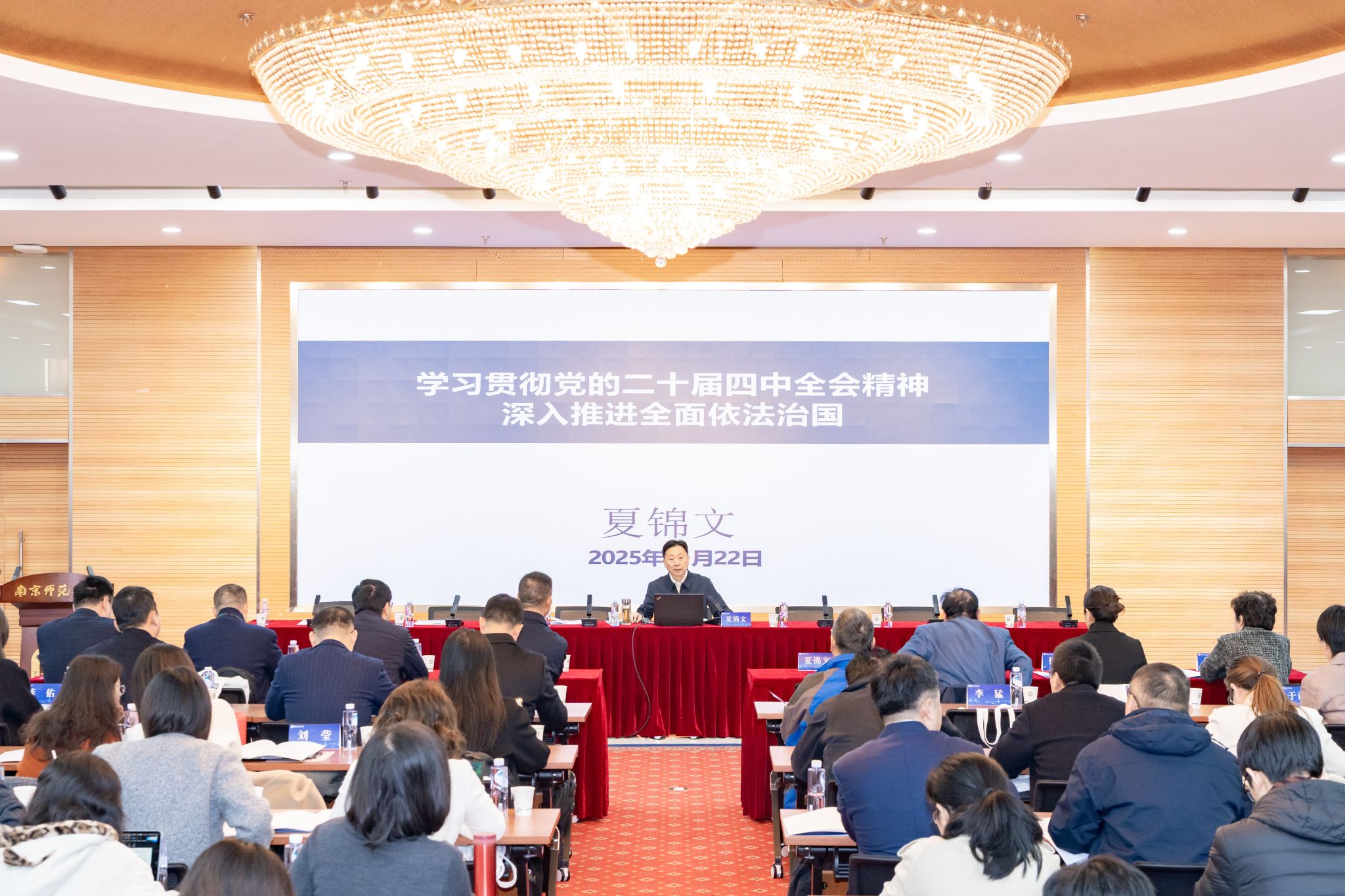 最后,学校隆重邀请了夏锦文教授作题为《学习贯彻党的二十届四中全会精神 深入推进全面依法治国》的专题报告,夏教授从准确把握“十五五”时期我国发展所处的历史方位、深刻领会“十五五”时期经济社会发展指导思想的丰富内涵、深入理解“十五五”时期经济社会发展必须遵循的原则、充分认识《建议》关于法治中国建设的新要求、《建议》关于全面依法治国的其他重要部署等五个方面深入解读了全会精神,为与会者深刻把握新时代法治建设方位与要求提供了重要指导。