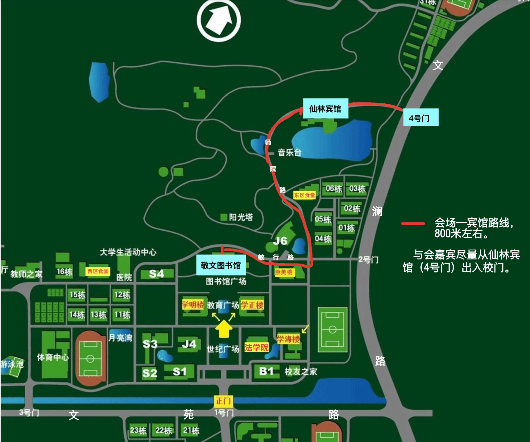 导航地址:南京师范大学仙林校区4号门——南京师范大学仙林宾馆(南京市栖霞区文澜路28号南京师范大学4号门内,南京警察学院正门对面,请与会代表从4号门进入校园)