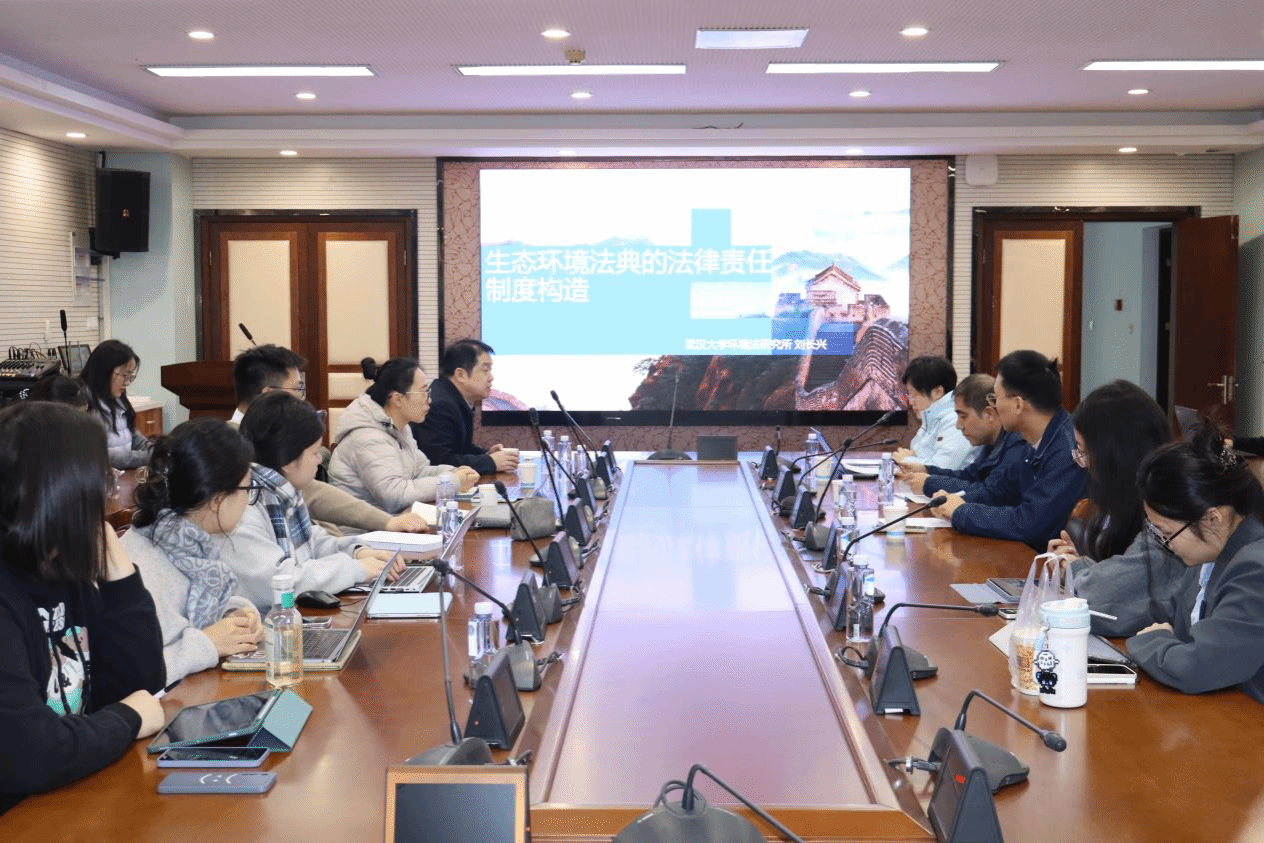 2025年11月30日上午,“生态环境法典的法律责任制度构造”学术讲座在南京师范大学顺利举行。本次讲座特邀武汉大学环境法研究所刘长兴教授担任主讲嘉宾,由南京师范大学法学院院长助理、环境法教研室主任章楚加副教授主持。常州大学卫乐乐老师、南京信息工程大学法学与公共管理学院法律系副主任周娴老师、南京林业大学王中政老师、南京航空航天大学彭璞老师等学者参与与谈。我院本硕博学生积极参与,现场学术氛围浓厚,交流热烈。